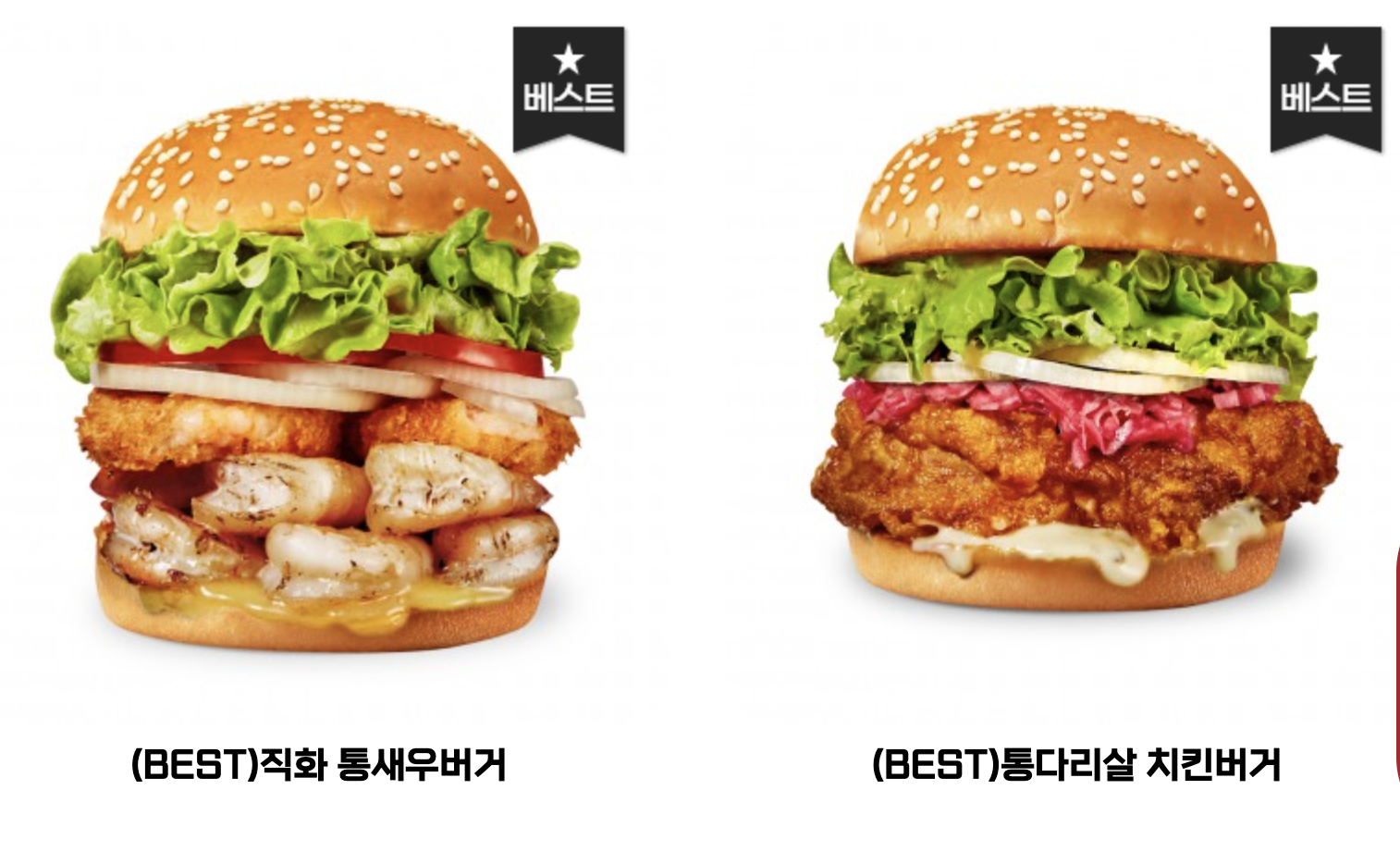 직화 통새우버거 : 런치 빵 속 알싸한 특제 와사마요 소스로 바삭한 새우링과 탱글한 새우를 통으로 듬뿍 들어간 놀라운 맛의 통새우버거